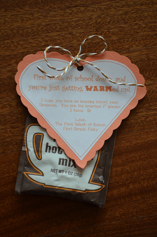 Friday: "First week of school down, and you're just getting WARMed up!" (attached to a package of hot chocolate mix)